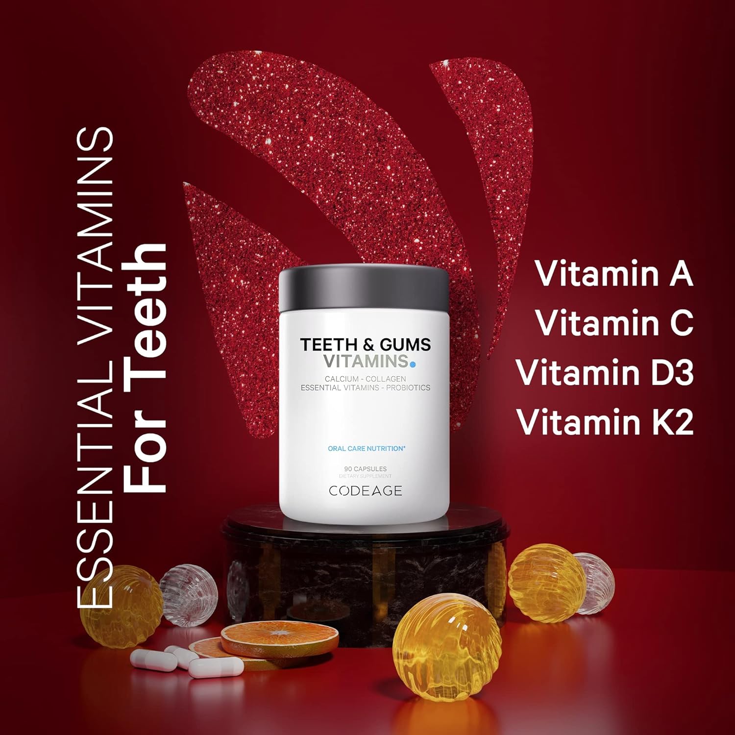 - Multivitamin for Teeth and Gums: Codeage Teeth & Gums vitamin offers essential vitamins A, C, D3 & K2 in an advanced oral care supplement. Vitamin A is important for forming the enamel, a layer that keeps teeth strong and resistant to substances that may cause cavities.* Vitamin C for teeth may help support gum health and prevent teeth decay by promoting saliva production and collagen synthesis.* Vitamin D may help with calcium absorption, while vitamin K2 may play a role in remineralization.*