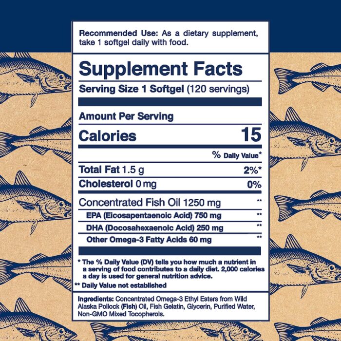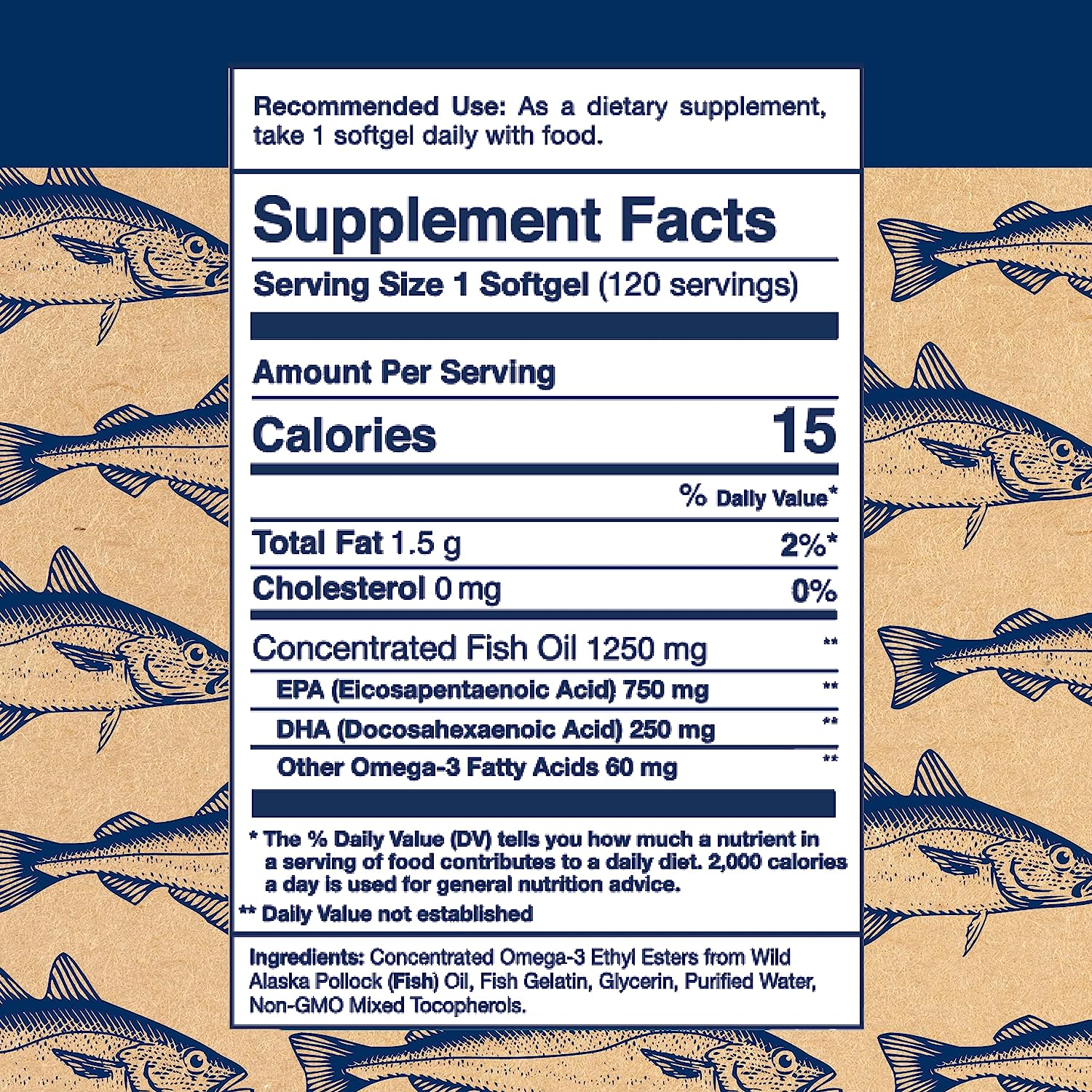 • Concentrated EPA for Increased Omega-3s: This fish oil supplement contains 750mg EPA and 250mg DHA for a total of 1000mg of wild-caught Alaskan Pollock omega-3 in just 1 softgel per day